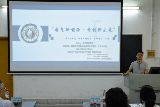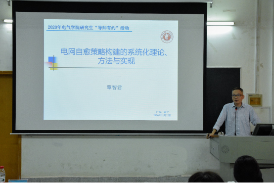 覃智君老师的学术讲座题目是“电网自愈策略构建的系统化理论、方法与实现”。讲座内容主要包括电网自愈的研究背景、理论体系、策略构建与评估的系统化方法以及软件实现四个方面。首先,覃老师在介绍研究背景时,就指出了自己2010到2017年期间所从事学术研究的重要意义:破解了电网自愈恢复阶段“只能依靠调度人员经验手动操作执行,恢复策略难以泛化”的难题,实现了电网自愈恢复由“工程问题”向系统化“科学问题”的转变。在之后的理论体系部分,提出了“通用恢复里程碑(GRM)”,它由电网自愈回归正常运行的一系列程序和状态组成。该理论的提出,使得不同的电网自愈策略能够在一个理论体系内生成,并可以根据不同地区的能源结构、针对不同的停电场景产生不同的恢复策略。在后两部分,覃老师结合电网恢复决策支持系统软件的开发过程和广东电网极端灾害应急调度的应用实例,详细阐述了自己的科研历程和所做的研究工作。覃老师的演讲风趣幽默、通俗易懂,其丰富的内容引发了同学们的深思,给相关领域的同学提供了新思路、新启发。