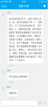 电气197班:同学们通过在易班等社交平台表达了对于此次学习的思想感悟以及互相积极鼓励学习先进知识,交流了抗疫的小知识与实时的疫情防控信息。做到第一自己坚守阵地自我保护不为抗疫添乱,其次积极为朋友和家人传播正确的抗疫斗争思想,做到力所能及地为中国抗疫添一份自己的力量