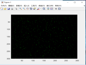 运行代码实现的效果是:第一次的效果(即无相应防治措施时)(绿色为感染者)可见感染者急速增加,病毒大范围传播,如图A.第二次人员停止流动,进行隔离后,并且有专门医院收治感染者(取消注释22,24行),如图6。由图可以发现,在进行人员隔离和感染者及时收治后,病毒传播速度进一步下降,感染者人数进一步下降,并且一段时间后感染者人数不再增加。