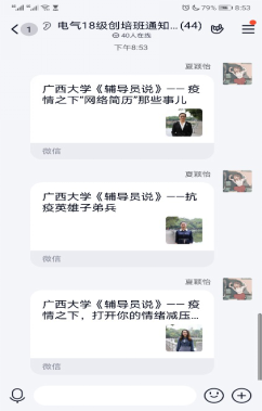 电气194班:194班以学习小组的形式展开学习,认真组织思考讨论,服从学校安排,善于创新、敢于先行,充分发挥“互联网+小组学习”优势,实现了我院“停课不停学”,大力开展科普防疫知识的宣传与交流,为打赢疫情防控阻击战贡献自己的力量。
