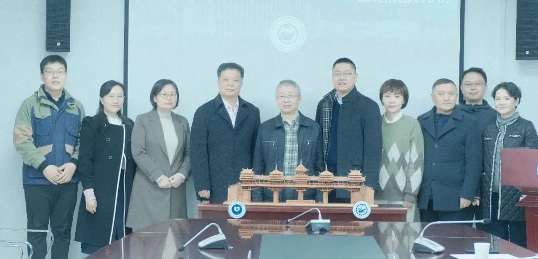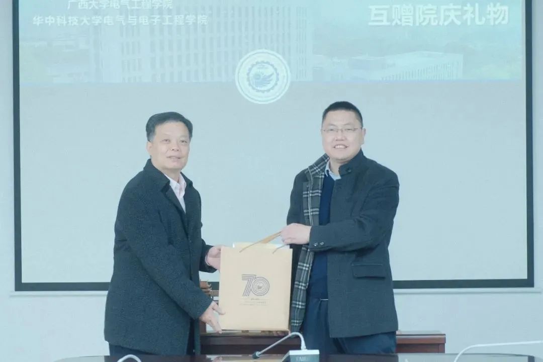 随后,两院领导互赠礼物并合影留念。我院以一座风雨同心桥为礼,寓意两校携手奋进,风雨同心;华中科技大学电气与电子工程学院也向我院赠送院庆纪念品一套。