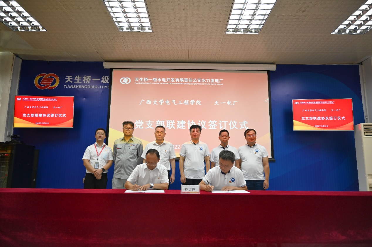 在天一电厂,亚洲爆乳无码精品AAA片久久久久亚洲电气党支部与天生桥一级水电开发责任公司水力发电厂党支部举行党支部联建签约仪式和揭牌仪式。两个党支部充分发挥各自的优势和特点,在党建工作框架下开展人才培养、科研合作、实习实践、文化建设等活动,促进基层党建工作特色化、制度化。社会实践团观看了天一电厂成立20周年宣传片,在厂房学习和实践,了解企业发展历史和“卓越之道,天人合一”的企业文化,学习天一电厂支部建设先进经验与企业管理的创新做法。