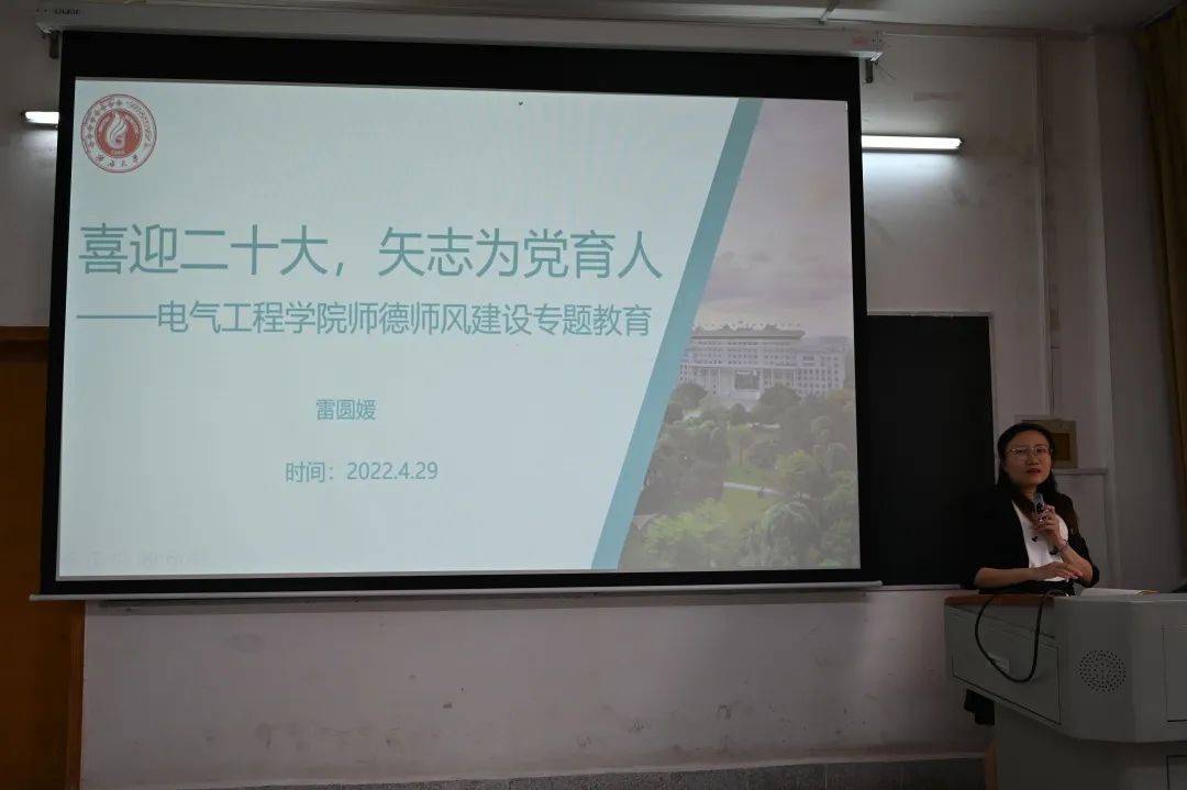 学院党委副书记、纪委书记雷圆媛以“喜迎二十大,矢志为党育人”为主题,开展“师德师风”建设专题教育。雷圆媛副书记结合习近平总书记关于“师德师风”的重要论述以及《亚洲爆乳无码精品AAA片教师失德失范行为处理办法》,详细解读我校师德负面清单,以生动案例给全体教职工上了一次形象生动的“师德师风”教育课,引导广大教师时刻自重、自省、自警、自励,努力打造具有政治素质硬、业务能力精、育人水平高的高素质教师队伍。