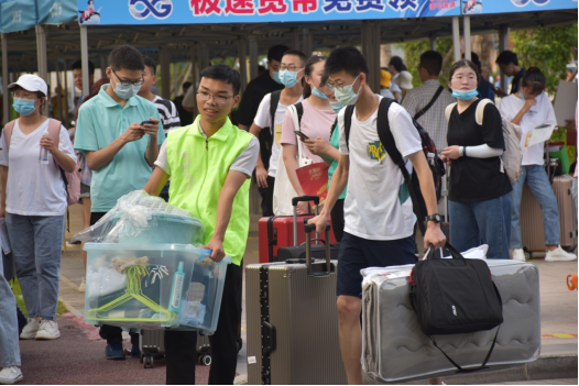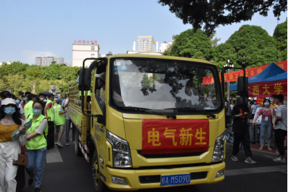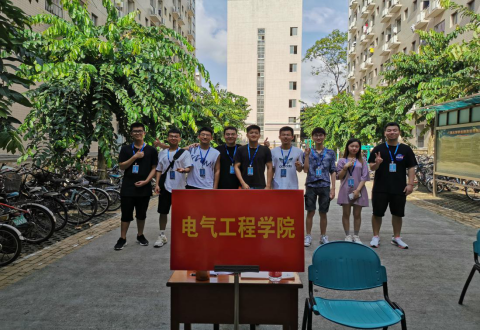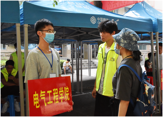 在迎新现场,志愿者们身着印有电气标志的黄绿色马甲,满怀热情地迎接每一位前来咨询的新同学,帮助他们搬运行李、引导至校车等候点。中午,日光曝晒,炎热却并没有消褪志愿者们的积极与热情,他们高举院牌坚守岗位,给学弟学妹们留下了坚韧卓绝、亲切周到的好印象。