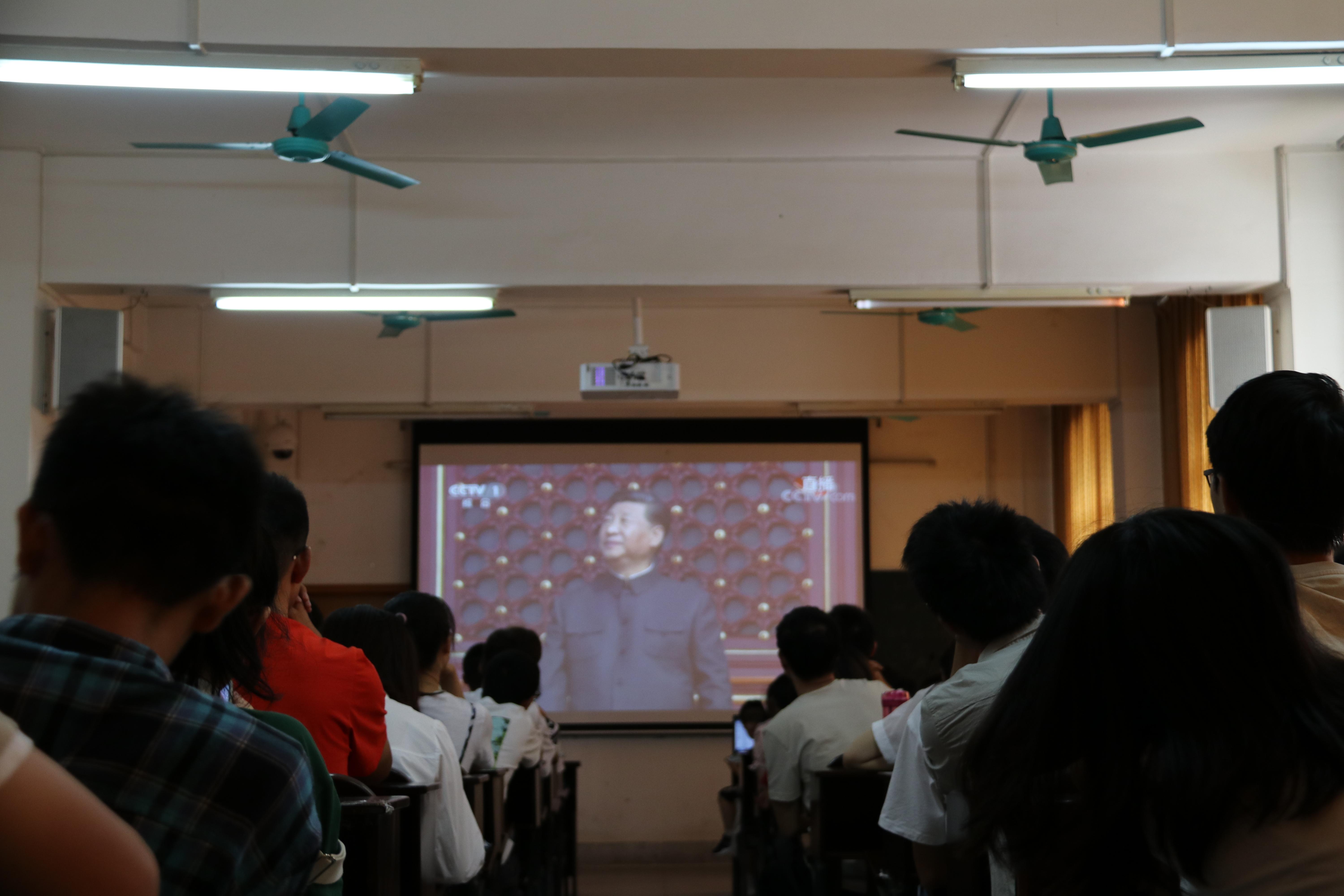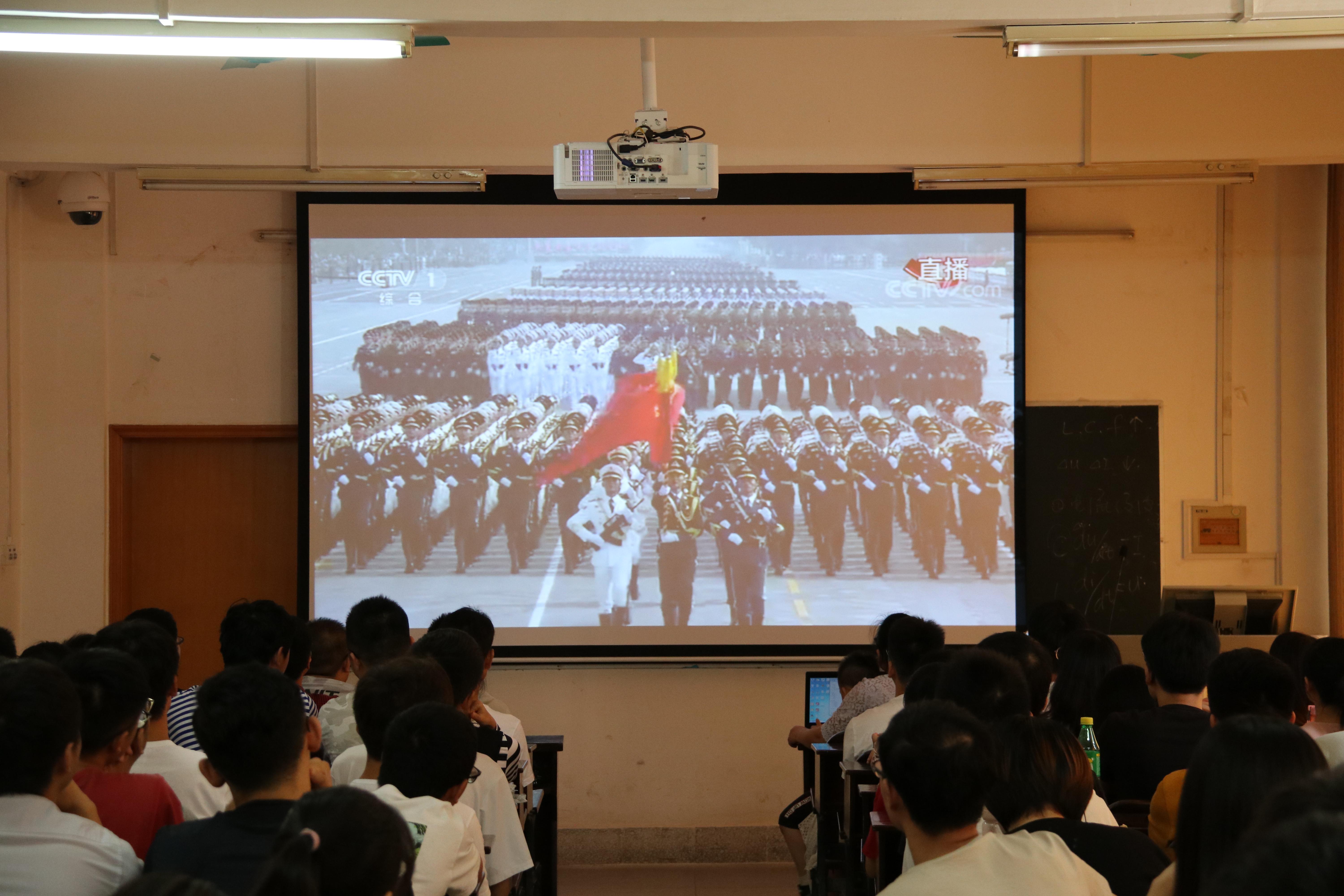 强国必须强军,军强必定国强。党旗、国旗、军旗迎风招展,阅兵式在受阅官兵整齐坚定的步伐中拉开序幕。此次阅兵集中展示了七十年来中国人民军队由弱到强的壮阔画卷。旌旗挥动,彩烟绚烂,雄师利器,英雄辈出,惊天动地,威武雄壮,气撼山河!师生们目不转睛地盯着屏幕,为阅兵的气势所震撼。随后壮美而热情、恢弘而热闹的群众游行,也彰显了70年来新中国在中国共产党的领导下取得的巨大成就,让同学们深深感受到祖国站起来,富起来,强起来的伟大征程的来之不易,深深感受到作为中国人的骄傲与自豪。