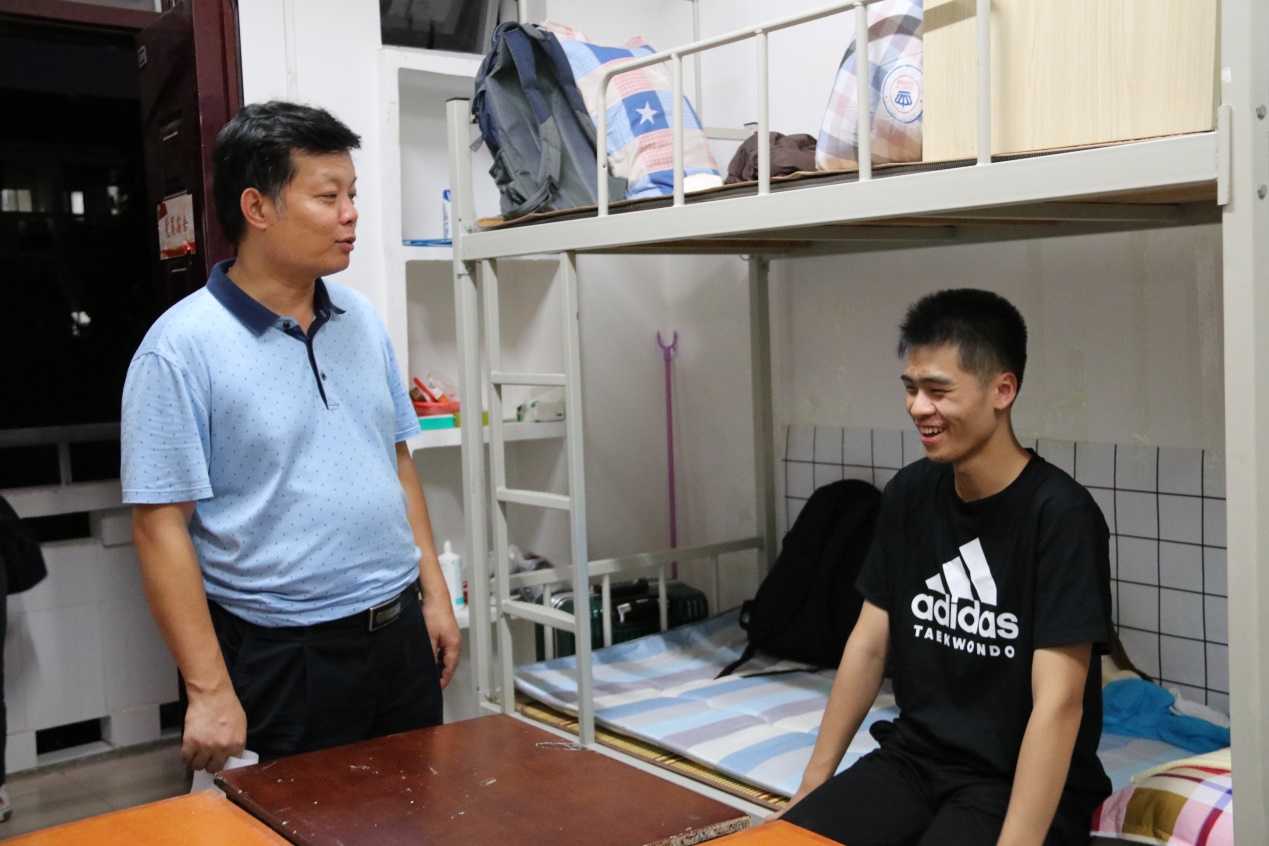 梁志坚副书记和刘辉副院长到新生宿舍,了解到同学们来自天南海北,有着不同的生活习惯,详细询问了他们到校后的适应情况,表达了对同学们的关心。宿舍内其乐融融,一位同学询问遇到困难是否可以找梁老师,梁副书记当即与该同学互加微信,不仅拉近了与同学们的距离,更是表现了梁副书记和蔼可亲,与同学们亲密无间的关系。