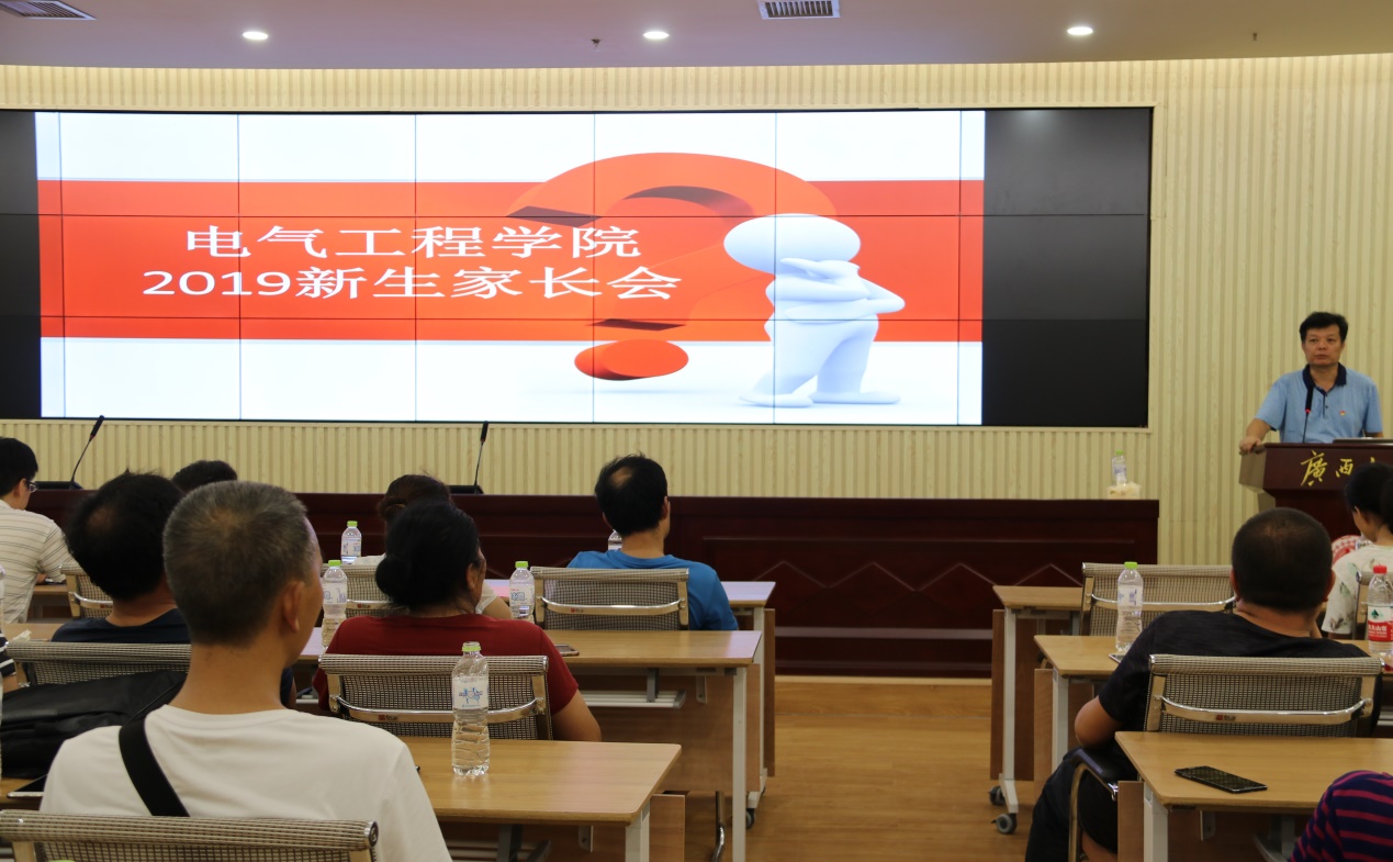 下午16:00,久久久久亚洲在新闻大楼一楼东报告厅召开了2019级新生家长会。学院党委副书记梁志坚老师、学工组老师、19级新生班主任及200多位新生家长参加会议。会议由党委副书记梁志坚老师主讲。