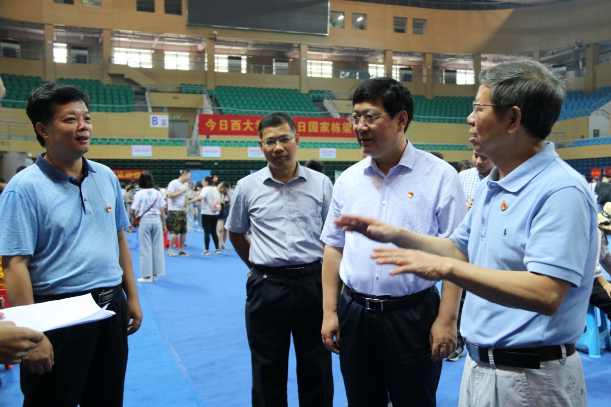 上午9:00,校党委书记刘正东,校长赵跃宇等领导来到学院报到点视察新生注册工作。校领导在我院新生注册点与在场院领导沟通交流,询问新生报到情况,并向现场报到注册的新生和家长表达欢迎和慰问。