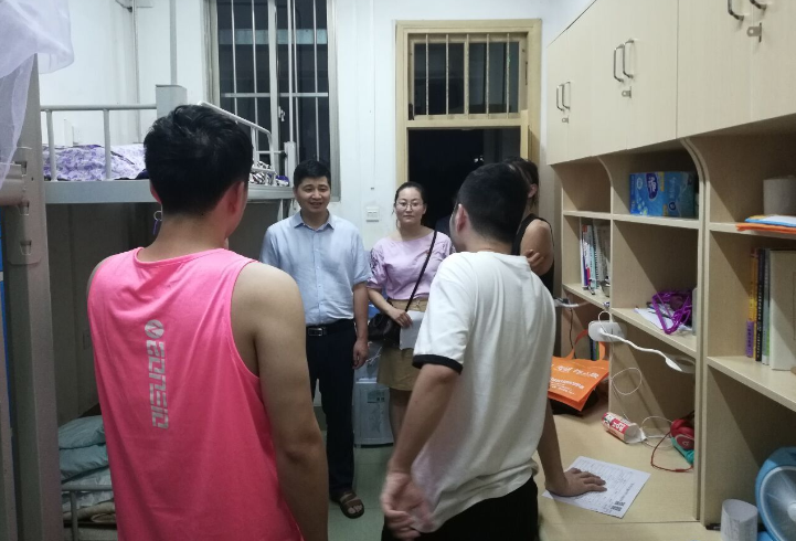 晚上19:30,学院党委副书记梁志坚老师、副院长刘辉老师、团委副书记石建有老师、学工组蒋冬连老师、孙晓黎老师、李鹏老师、魏书颂老师、李娟老师一同到西一栋、西四栋、西六B栋及研究生宿舍看望2019级新生。