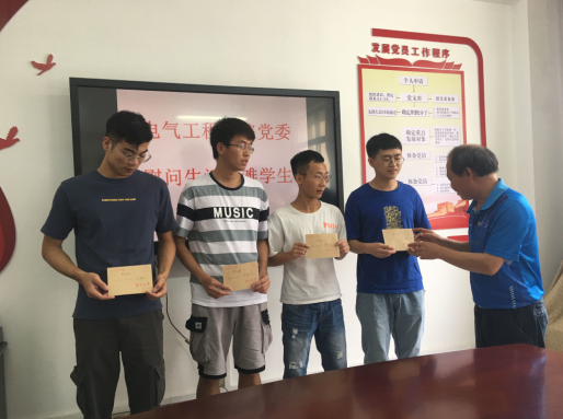 梁京章书记详细询问了困难学生的家庭情况和学习、生活状况,鼓励他们放下包袱、安心学习,顺利完成大学或研究生阶段的学习,并给他们发放慰问金。研究生181班周嘉生、电气工程及其自动化173班熊伟等生活困难学生表示,很感谢学院党委和老师的关心,一定会好好学习,做一个对国家、对社会有用的人。