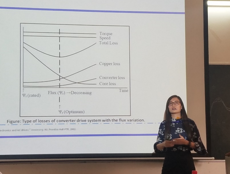 21日上午10点,沈思怡博士在久久久久亚洲304室给学院师生作了“直接转矩控制感应电机驱动的能源效率优化”的学术报告,报告从感应电机空间矢量出发,讨论了基于铁耗感应电机的空间矢量方程,并推导了感应电机在确定输出转速和转矩情况下的最优损耗磁链方程。随后,张子敬博士给大家作了题目名为“智能优化与工程技术”的专题报告,研讨了利用Q-学习算法来进行光伏系统的输入输出数据回归分析并演算其动态式黑箱模型参数。这参数可用来编写遗传算法中的适应度函数,使其能更精准的搜索最佳解决方案。