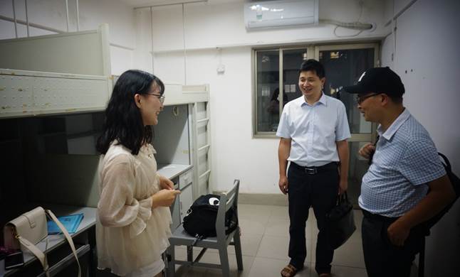 双院长、刘副院长一行先后来到西23栋、南区1栋、2栋学生公寓探望新生,亲切地与同学和家长们交谈,了解大家的家乡、学业和报道手续等情况,并对大家提出的问题给予了热情的解答。