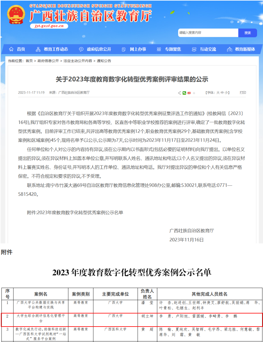近日,广西壮族自治区教育厅根据《自治区教育厅关于组织开展2023年度教育数字化转型优秀案例征集评选工作的通知》(桂教网信〔2023〕16号),组织专家对各市教育局和各高等学校、区直各中等职业学校推荐的案例进行评审,我院“大学生综合测评信息化管理平台”获评教育数字化转型优秀案例。 图 | 广西壮族自治区教育厅公示信息 “大学生综合测评信息化管理平台”项目是基于学院程序设计大赛竞赛题目孵化的产品,在胡立坤、李勇等老师的指导下,通过组建师生联合研发团队,面向目前大学生综合测评的主要工作,自主研发了一套大学生综合测评信息化管理平台,解决了传统学生综合测评工作中存在的数据采集与管理繁琐以及测评流程不规范、数据保存及分析难等问题。在学院学工组和教学办的大力支持下,多位师生的共同努力下,该平台已在学院近3年的学生综合测评中应用,极大提高了学生综合评价工作的效率,提升了学院办公的数字化与信息化水平。 据悉,在教育数字化转型进程中,久久久久亚洲始终秉承创新精神和实践探索,致力于构建智慧教育和提升教育教学质量。除“大学生综合测评信息化管理平台”外,我院师生合作自主研发的“教师公共服务学时统计系统”“课程达成度分析信息化系统”等一系列教育数字化平台,也逐步投入使用。在多个数字化与信息化系统的研发中,吸引了我院越来越多的学生参与,近2年,基于学院众创空间平台,通过组织学生参与院级竞赛项目和系统研发项目的训练,培养了百余名具有数字化与信息化系统开发经验的学生。此次优秀案例的入选,也表明我院推进“新工科”教育改革中基于众创空间平台实现理论与实践相结合,“以赛促学、以赛促教、以赛促创”,紧扣实际需求,孵化和转化创新成果的工程教育模式在教育数字化转型中具有代表性和推广价值。 下一步,我院将继续落实上级的各项要求,深化信息技术与教育教学的融合,持续推动教育数字化转型,进一步提升教育质量和效率,为培养更多优秀人才贡献力量。