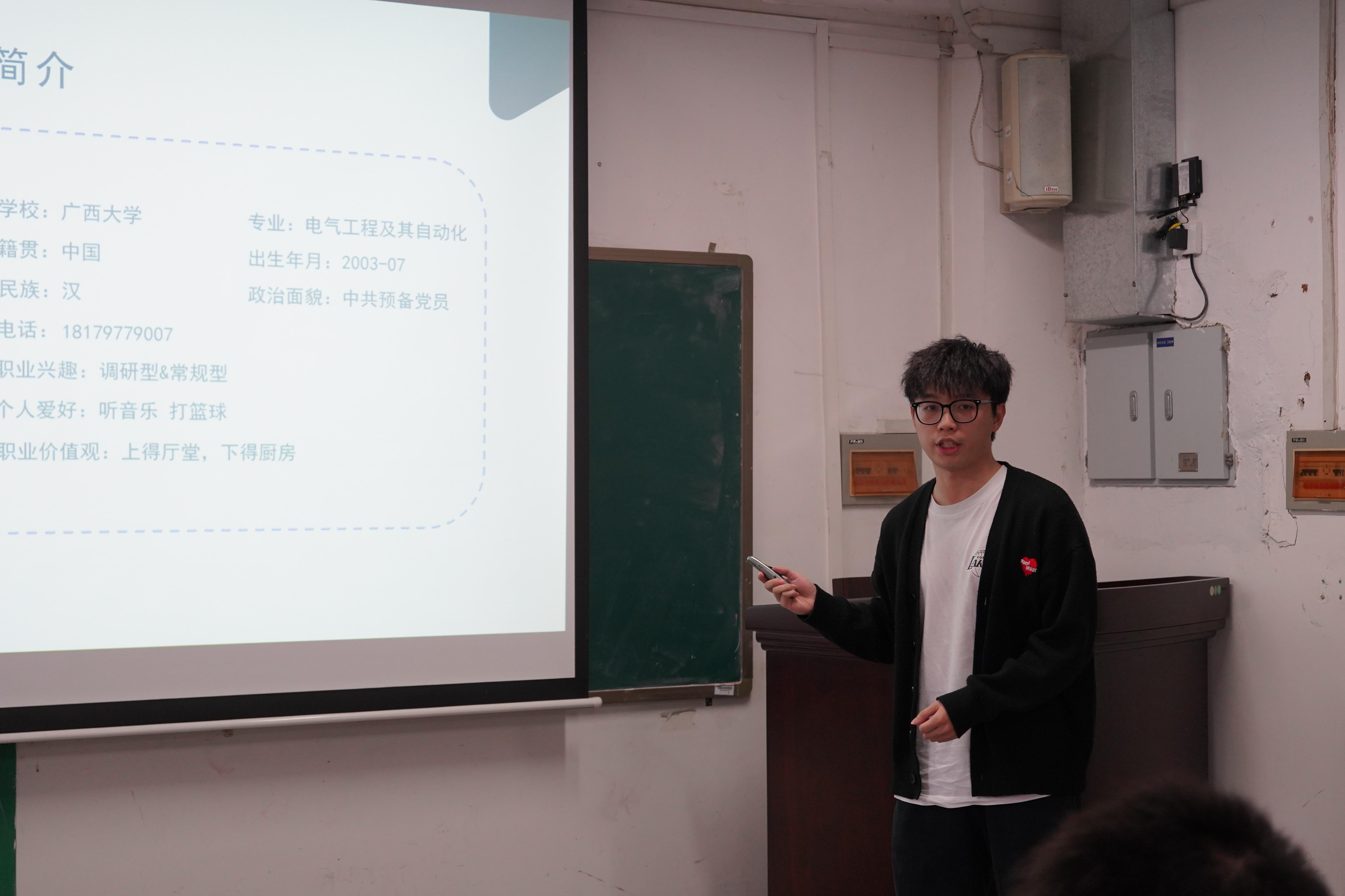 在钟丰蔚同学的展示中,他通过自我认知、环境分析、SWOT分析、职业定位、实施方案向大家介绍了专业具体的职业规划,展现出全面的综合能力。他希望可以立足现在,放眼未来,秉持“为祖国健康工作五十年”的爱国之心,做一名既怀抱梦想又脚踏实地的电气人。