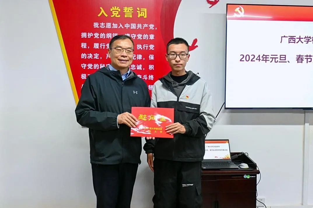 在春节来临之际,为做好党内激励关怀帮扶工作,传递组织温暖,1月15日下午,亚洲爆乳无码精品AAA片党委副书记、校长韩林海,学工部(处)部(处)长黄必春,党办校办副主任廖文丹,党委组织部副部长陈世扬等一行4人到我院走访慰问生活困难党员。院党委书记梁志坚、院长武新章、团委书记石建有、团委副书记蒋冬连以及学生党员代表刘洧杰参加本次慰问活动。 活动伊始,韩林海校长询问了刘洧杰同学的学习、生活、家庭情况,并鼓励刘洧杰同学继续保持积极向上的精神面貌,学好专业课程,锤炼品格,不断进步,实现全面发展。 韩林海校长(右一)慰问刘洧杰同学 随后,韩林海校长代表学校党委为刘洧杰同学送上新春的祝福和慰问金。 韩林海校长与刘洧杰同学合影 此次走访慰问活动,让生活困难党员同志感受到了党组织的温暖和关怀,也激励他们踔厉奋发、勇毅前行,让青春在全面建设社会主义现代化国家的火热实践中绽放绚丽之花。