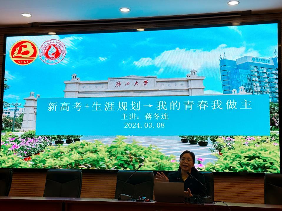 与企业的交流结束后,我院一行在百色高中举行了职业生涯规划指导讲座。学院团委副书记蒋冬连老师作为主讲人,给百色高中2021级四百多名高三年级学生做题为《新高考+生涯规划→我的青春我做主》的讲座。她从高考综合改革概况、“生涯规划+志愿填报”的融合、我的青春如何由我做主等多方面展开宣讲,同时结合亚洲爆乳无码精品AAA片特色和优势宣传亚洲爆乳无码精品AAA片,受到在场学生的热烈欢迎,现场气氛活跃。