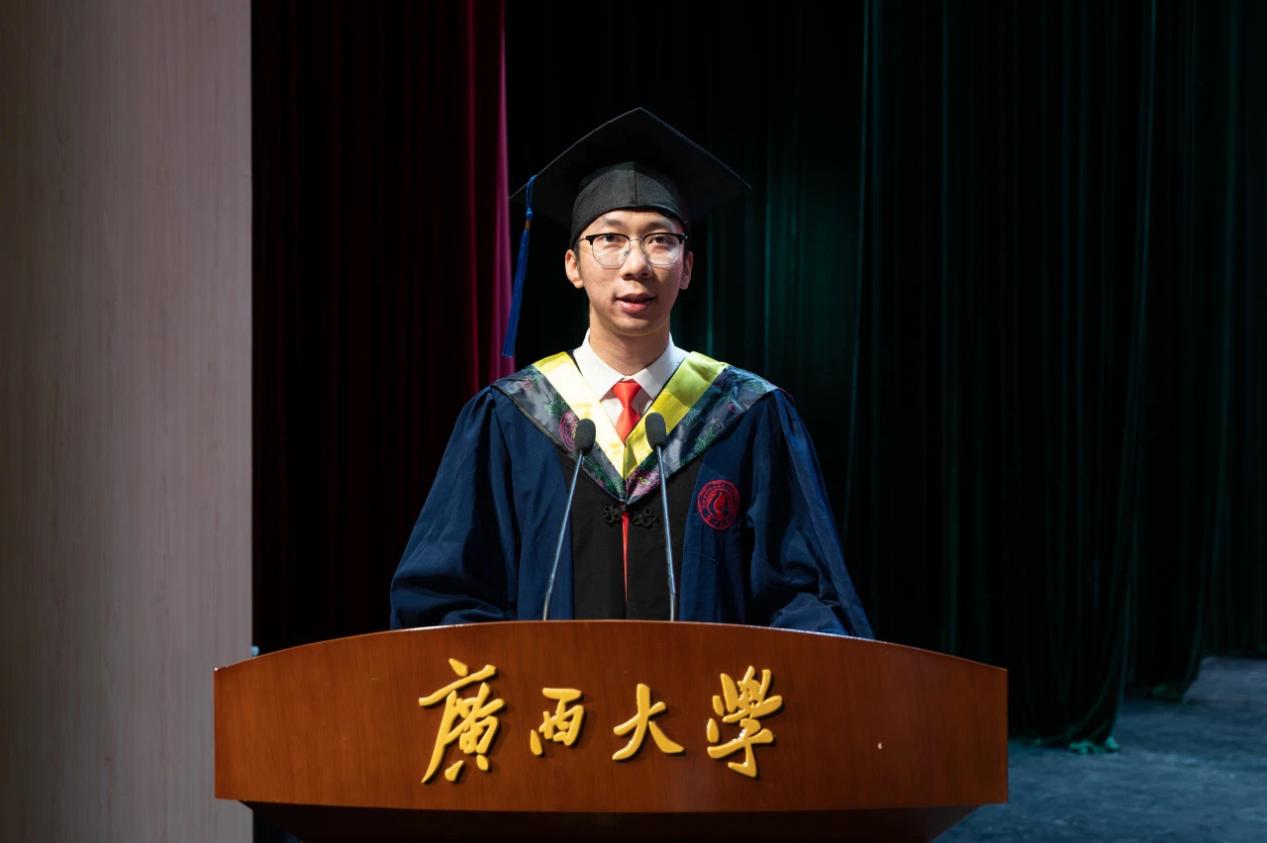 能源动力213班研究生文育作为2024届毕业生代表发言,他回顾了在学校潜心科研、服务学生工作的时光,在这段与祖国同行、与母校共进、与同窗共奋斗的日子,让他更加深刻地理解了友情、责任、梦想。他表示,将坚韧不拔、团结勇敢地迎接挑战。