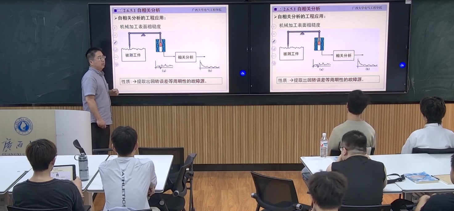 观看视频后,韦老师首先肯定视频中的加工精度满足了要求,同时引出“要检测视频中的核容器加工表面是否存在周期性误差,应该怎么做”的问题,根据此问题引出自相关分析算法的数学原理,着重强调了“噪音信号的自相关函数随时移迅速衰减,而周期信号的自相关函数仍然是同频率的周期信号”的重要性质,引导同学们思考解决问题的思路。最后,组织同学们探讨了“应用自相关分析法检测淹没在噪音信号中的周期信号,以发现核容器加工表面是否存在回转机构偏心引起的周期性误差”的原理和实现技术。