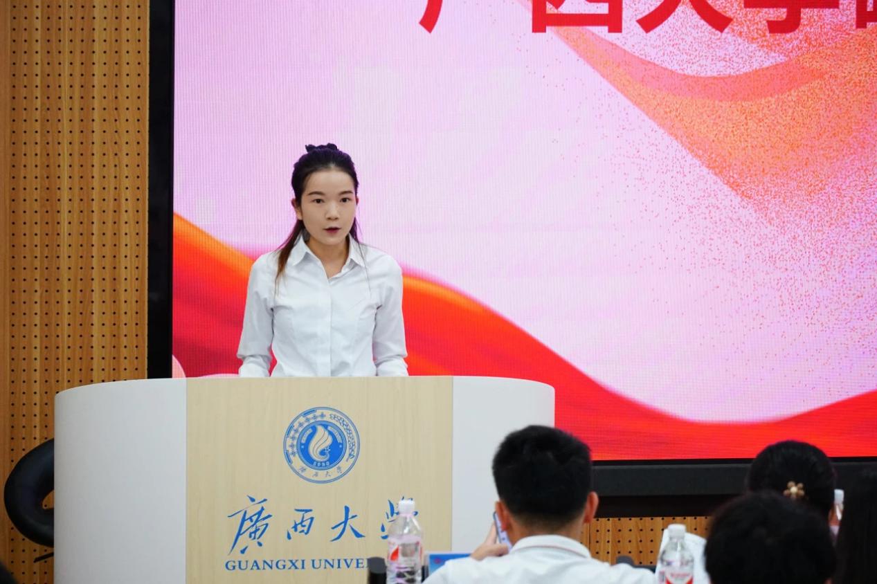 大会选举出的第二十一届研究生主席团成员莫书琴以大会的名义向全院同学发出倡议:第一,坚定理想信念,争当时代先锋。第二,掌握真才实学,练就过硬本领 。第三,锤炼品德修为,担当家国大任。