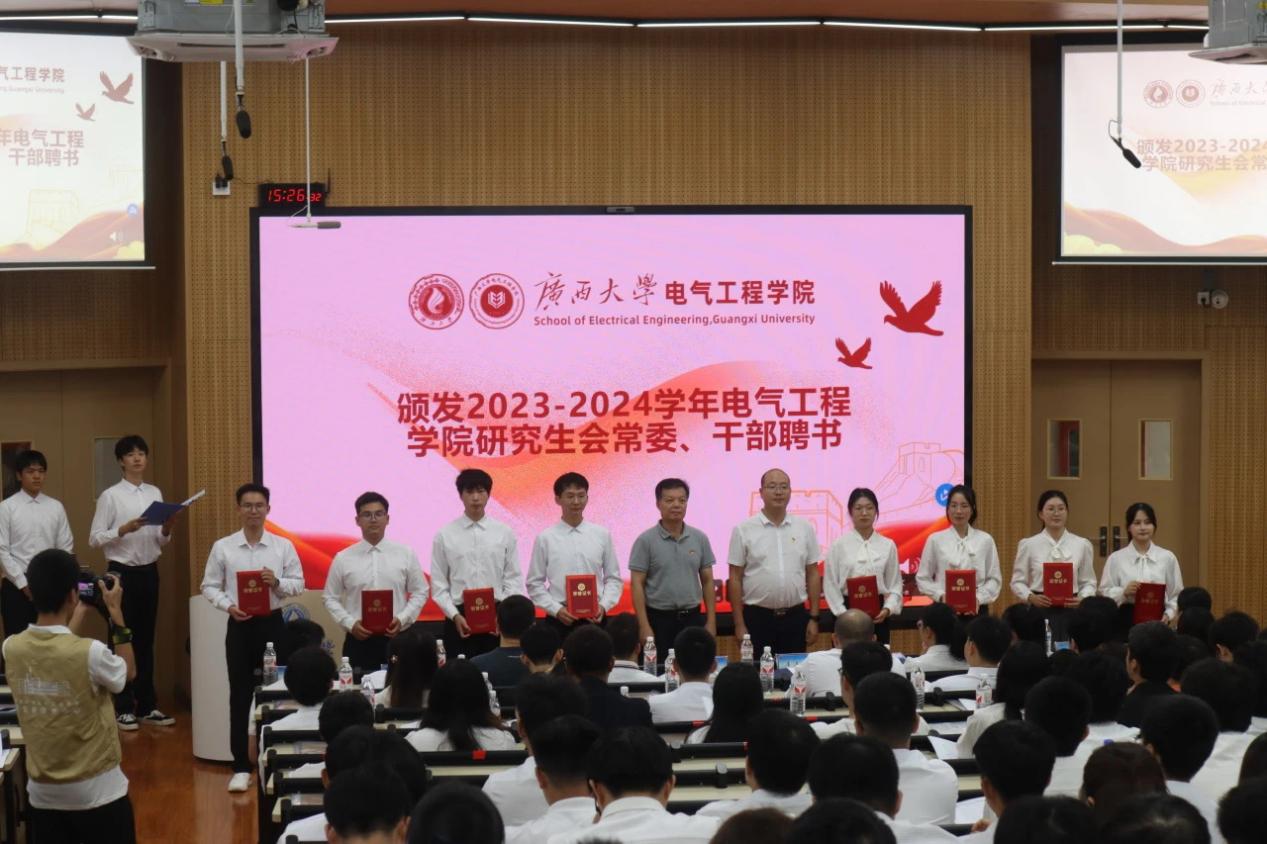 梁志坚书记和李道洋副书记为上一届研究生会常委和干部颁发聘书。