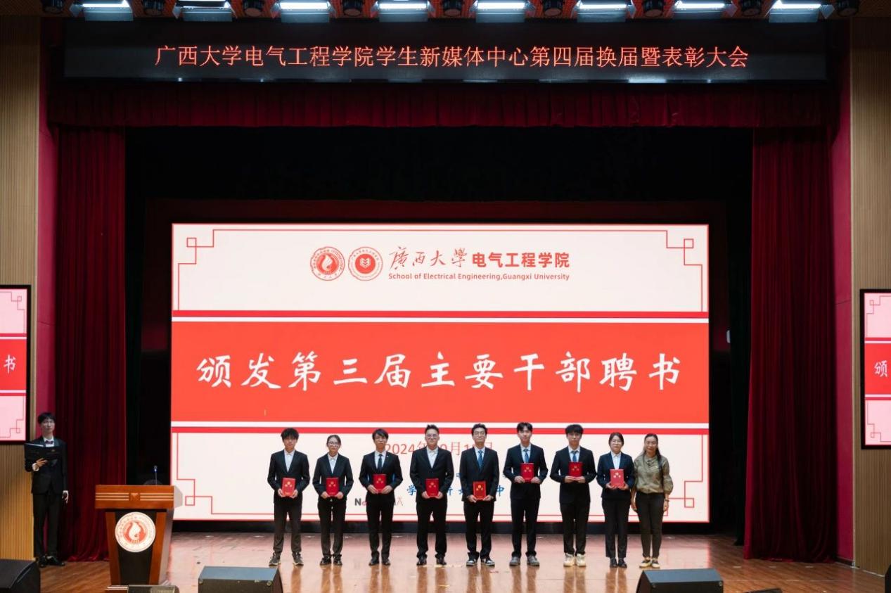 接着,冯敏老师宣读第三届学生新媒体中心成员表彰名单,为获奖成员颁发荣誉证书;李娟老师宣读优秀新媒体人表彰名单并为其颁奖;蒋冬连老师为第三届学生干部颁发聘书;冯敏老师宣读第四届干部聘任文件。
