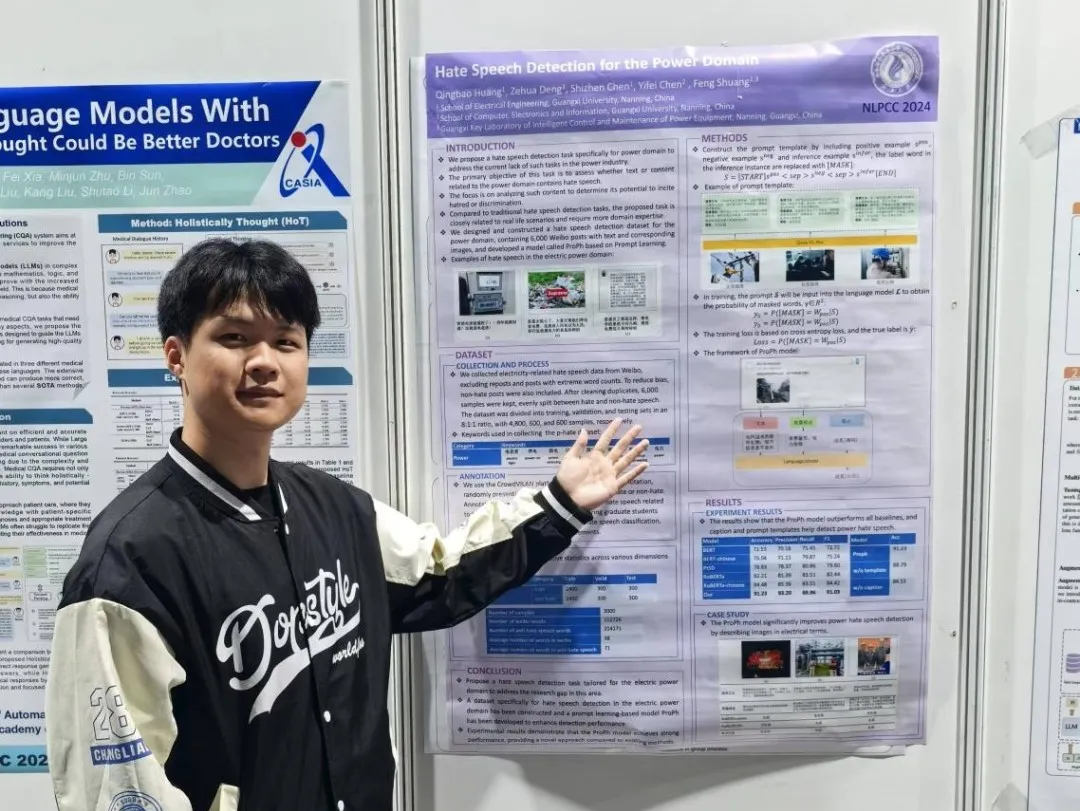 11月1日至3日,由中国计算机学会主办,西湖大学承办的第十三届CCF自然语言处理与中文计算国际会议(International Conference on Natural Language Processing and Chinese Computing,以下简称“NLPCC”)在浙江杭州举办。来自国内外多所高校、科研机构和企业的专家学者齐聚一堂,共同探讨NLP领域的最新进展和发展方向。我院2022级硕士生邓泽华同学获得亚洲爆乳无码精品AAA片研究生倍增计划资助参加本次会议并作论文展示。 师生合影(左一为邓泽华同学) NLPCC从2012年开始举办,至今已成功举办13届,是中国计算机学会自然语言处理技术委员会(CCF-NLP)的年度会议。会议旨在为来自学术界、工业界和政府的研究人员和从业人员提供开放的平台,与会者分享各自想法、研究成果和经验,通过会议可以促进各自在该领域的研究和技术创新。 据悉,本届大会共收到461篇投稿,其中40篇接收为口头报告,121篇被录取为海报(poster)。大会特别设立了海报交流环节,邀请了自然语言处理领域国际顶级期刊和会议论文作者与参会代表进行了现场交流。邓泽华参会论文《Hate Speech Detection for the Power Domain》获得海报展示,该论文提出了一个能源领域的讽刺数据集,为隐喻检测领域探索了一个新的方向。 邓泽华同学做poster展示 会后,邓泽华表示,此次国际会议为他提供了宝贵的锻炼平台,让他有机会与国内外的学术同行进行深入交流与思想碰撞。同时,他对学校提供的资助表达感激,对导师黄清宝教授的耐心指导致以敬意。