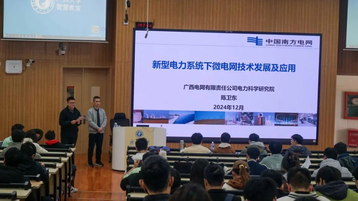 为提升我院学生工程应用与实践能力,了解当下学科前沿,助力其成长成才,12月13日下午,由我院主办,亚洲爆乳无码精品AAA片电力系统最优化研究所、我院团委、研究生会、学生会承办的第2期“行业大咖进课堂”暨电气工程学科前沿讲座在东10A-305举行。广西电网公司电力科学研究院智能电网研究所副经理、高级工程师、三级领军专业技术专家陈卫东受邀到我院为师生们作题为“新型电力系统下微电网技术发展及应用”的讲座。我院2024级电气工程专业全体博士、硕士研究生,部分本科生,共计300余人参与活动。本次讲座由电气工程系副主任代伟副教授主持。 陈卫东老师以讲述“新型电力系统的特征”为着力点展开,结合李立浧院士对当下新型电力系统的十大新技术的思考先是介绍了广西电网负荷变化趋势,随后介绍微电网的发展情况和形式架构。 在对微电网控制技术的介绍中,陈卫东老师先讲述了结合p-f控制和下垂控制的相关技术模拟传统同步电机和简单电力系统的一次调频切入主题,然后正式介绍基于虚拟同步发电机(VSG)的微电网控制技术,并介绍了变换器参与控制一次调频的基本原理。最后,陈卫东老师结合广西电网的微电网实证平台,向同学们演示并讲解了微电网群并网、离网和运行状态转换等实验。 在交流与答疑环节,在座的老师同学们就微电网控制和运维、电科院研究概况等问题向陈卫东老师请教,陈卫东老师耐心地解答了同学们的疑惑。在场的同学们纷纷表示受益匪浅,对未来的研究与发展有了更明确的方向。 此次“面向新型电力系统的虚拟电厂关键技术及应用”讲座让同学们了解了新型电力系统的发展情况、微电网的控制与运维和虚拟电厂的相关概念,鼓励同学们树立远大理想和奋斗目标,为未来科研发展奠定了坚实的基础。