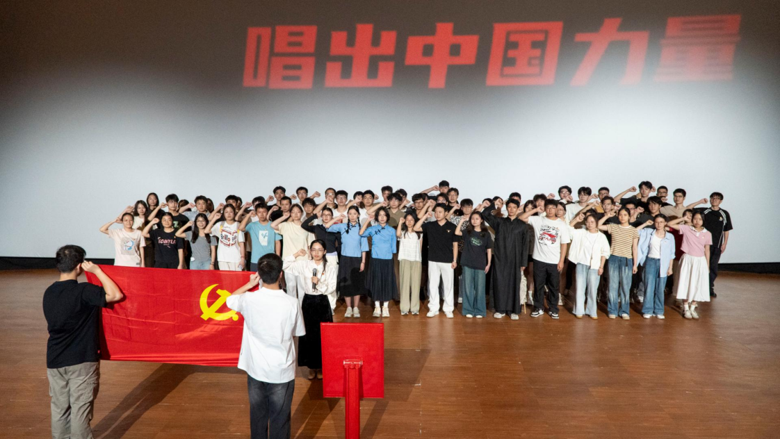 “我志愿加入中国共产党……” 在鲜红的党旗下,全体党员庄严举起右拳,重温入党誓词,铿锵誓言响彻影院。