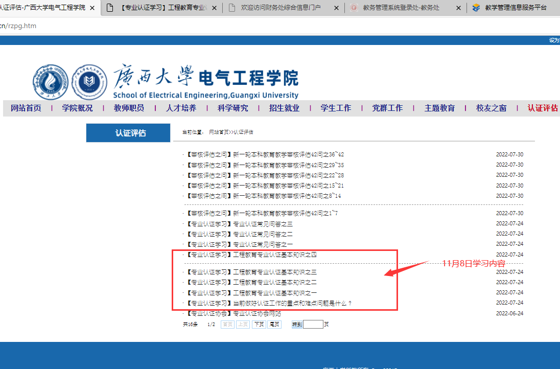 (1)工程认证学习。学习内容“工程认证基本知识”,内容所在:学院网站主页—认证评估专栏—【专业认证学习】工程教育专业认证基本知识之一~四。