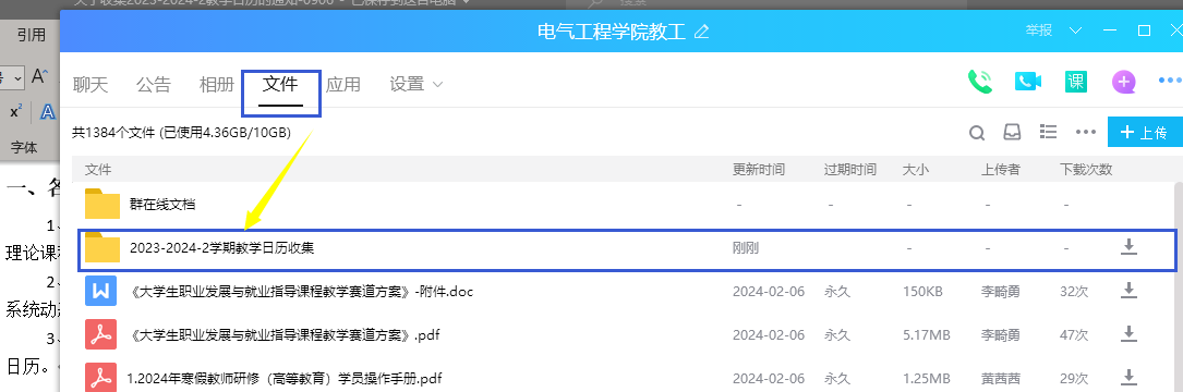(2)收集方式:进教工QQ群界面—文件—教学日历(2023-2024-2)文件夹—上传