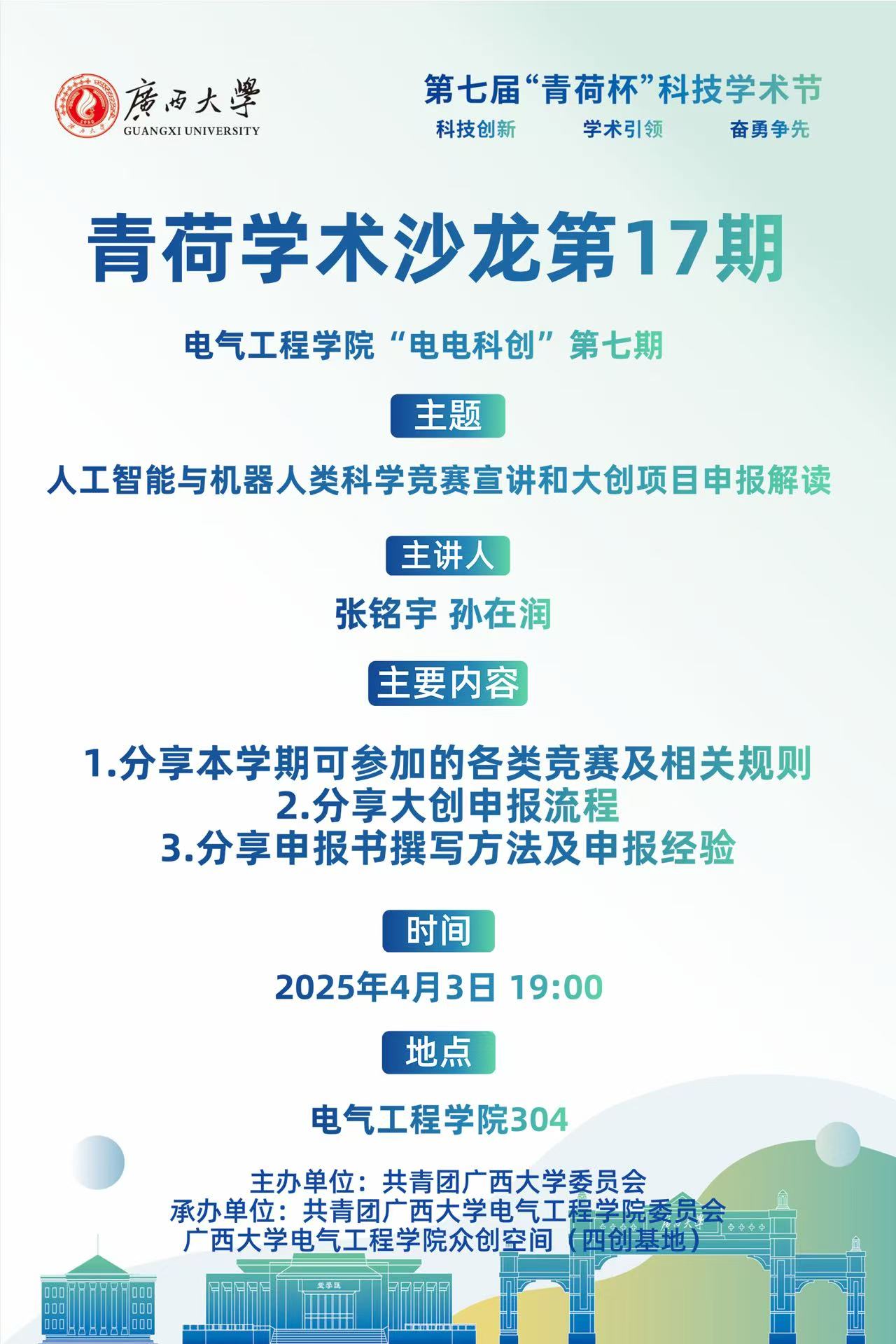 如何理解竞赛规则?如何规划申报节点?本期“电电科创”(青荷学术沙龙)将围绕人工智能与机器人类科学竞赛备赛技巧、大创项目申报要点展开,通过规则解析、案例复盘、流程梳理、材料拆解四大环节,分享竞赛备赛策略与大创申报经验。从赛事认知到实践细节,从创新思维到材料规范,用朋辈视角为你呈现可落地的备赛指南。