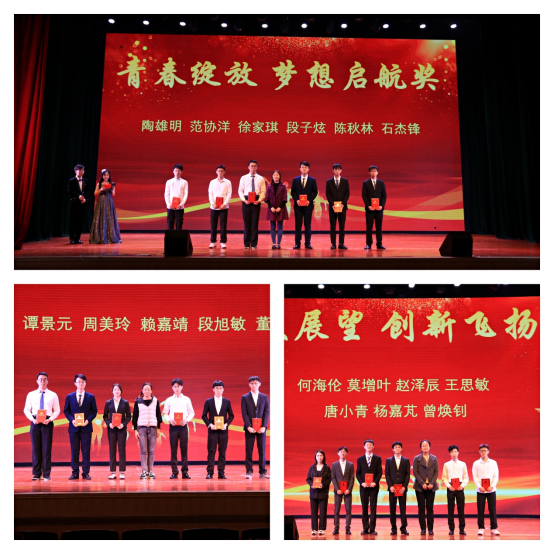 晚会现场表彰了2021年度创新创业工作表现优秀的学生。其中隆承雨、孙昕、莫明山荣获“最佳科技创新奖”“专业水平认证S级”;吴赵骁、卢子儒、刘东端等九人荣获“优秀竞赛奖”,其中吴赵骁、卢子儒、刘东端,许志强四位同学获“专业水平认证A级”,尹冠婷、夏颖怡、顾小梅三位同学获“专业水平认证B级”。此外,陶雄明、范协洋、徐家琪等六人荣获“青春绽放,梦想起航奖”;何海伦、莫增叶、赵泽辰等七人荣获“科技展望,创新飞扬奖”;卢阳旭、谭景元、周美玲等六人荣获“展翅拂晓,圆梦今朝奖”。