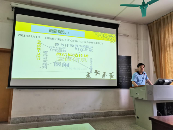 会上,学院党委副书记梁志坚以“增强法制意识,积极健康生活”为题,从法制教育的重要性、大学生常见犯罪行为、大学生犯罪原因和预防等几个方面,通过具体的案例,给大家分析了大学生相关的法律知识。特别是从大学生身边常见的盗窃、考试替考作弊、打架斗殴、赌博等案例中,重点强调了违法犯罪的后果,告诫学生要自觉学法、懂法、守法,培养积极向上的健康身心,做一个文明守法的新时代大学生。