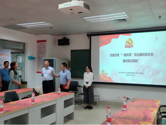 随后,久久久久亚洲研究生第二党支部书记徐俊华介绍样板支部的建设情况。面对支部存在支委班子不稳定、党员纪律较松散和党员发展不规范等一定的问题时,徐俊华书记决定从优化支部建设目标,重构支部发展路径开始做起,针对自身存在的问题明确总体思路,采取党员评星定级制度、支委文件云存档、多渠道宣传支部建设成果等一系列措施来解决问题。在这些措施的实施和管理下,研二支部迅速成长,并最终被评为全国样板支部。随后,双方就支部建设发展进行了交流。