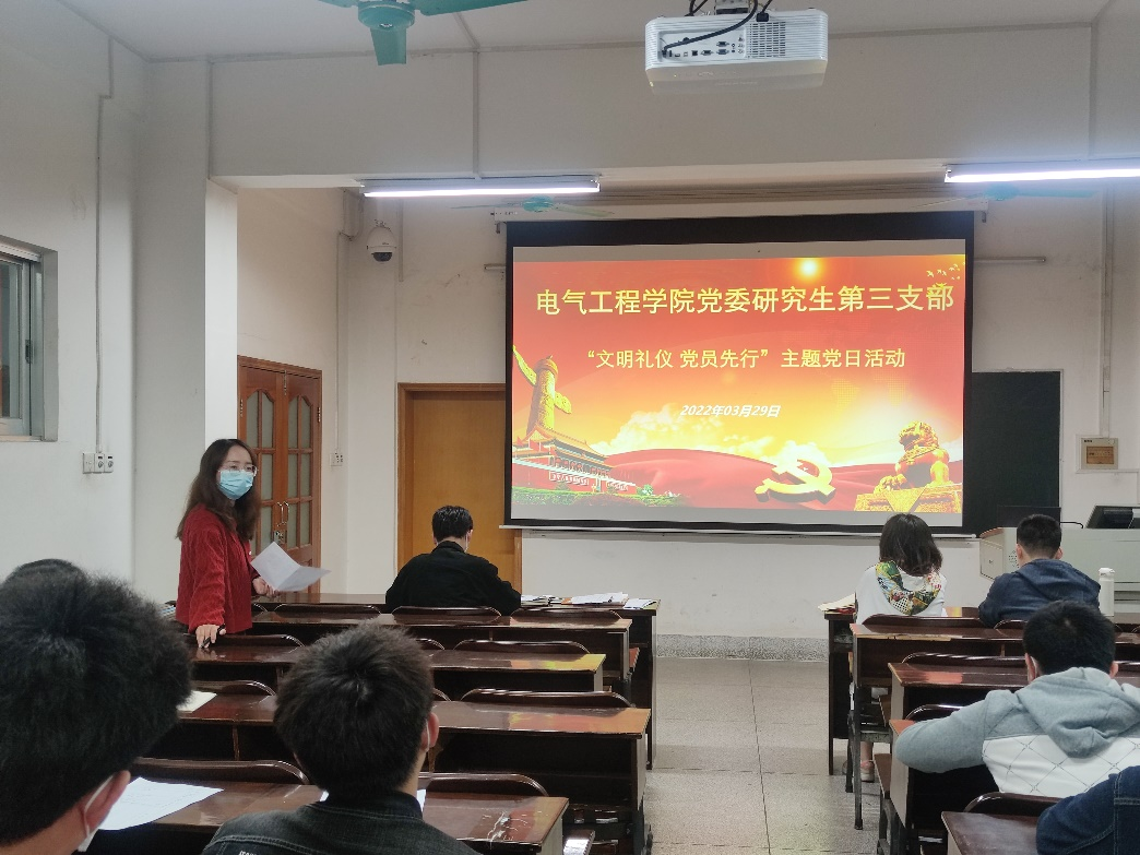 紧随着开展了以“文明礼仪,党员先行”为主题的党日活动。活动旨在提高研究生个人礼仪修养,加强研究生的自我规范、自我约束能力,能更好地帮助研究生实现自我价值,做到德才兼备。活动结束后,在座的党员同志们表示在今后的学习生活中将会更加注重自身的礼仪教育,成为一位优秀的高素质研究生。
