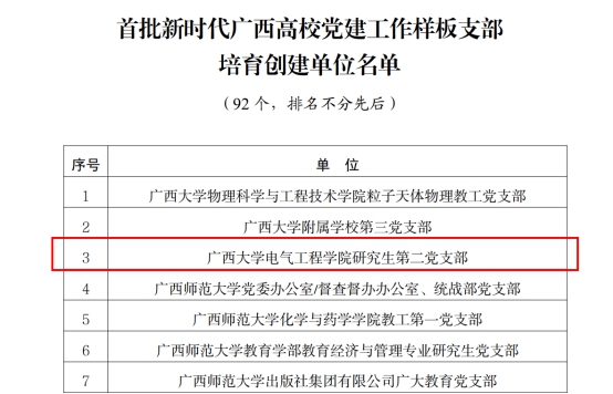 近日,自治区党委教育工委公布了首批新时代广西高校党建示范创建和质量创优工作、“双带头人”教师党支部书记工作室培育创建单位名单。我校久久久久亚洲研究生第二党支部入选“广西高校党建工作样板支部”培育创建单位。