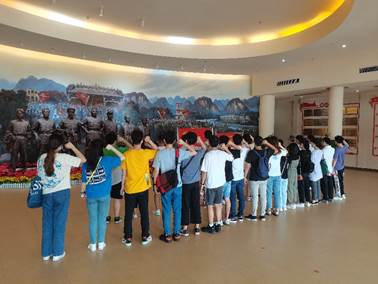 在小木棉志愿讲解员的带领下,党员同志们沿着纪念馆里当年红军走过的长征路,聆听着讲解员讲述长征路上各位英烈们浴血奋战、奋勇拼搏的英雄事迹,纷纷为之震撼,敬仰之情充盈于心。随后全体党员又跟随着讲解员前往广西国防教育馆继续进行参观。通过丰富的图片,逼真的模型、详细的解说,支部全体党员深刻感受到了我国新时代气势磅礴的大国国防力量。最后,全体党员前往革命烈士纪念碑公祭广场,为英烈们默哀三分钟,作为本次党日活动的结尾。