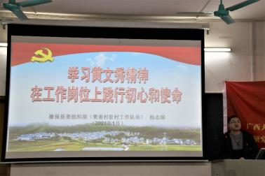 此次活动,杨志国同志从亲身经历出发,向在座党员同志宣扬了黄文秀精神,让我们感受到了扶贫工作的艰辛而伟大,感受到了扶贫干部的坚守与执着。正是这一群可爱的人,为国家的扶贫事业添砖加瓦,用美好青春诠释了共产党人的初心与使命。